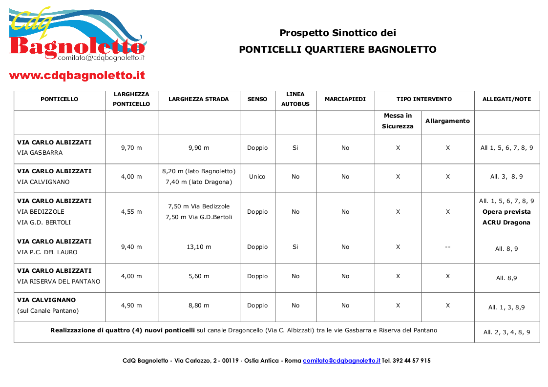 1 prospetto sinottico ove risultano evidenziati, la totale assenza di marciapiedi, l’ubicazione e la larghezza dei ponticelli e delle strade che vi confluiscono, i sensi di marcia degli stessi, se percorsi o meno dai Bus del trasporto pubblico, nonché il tipo di intervento ritenuto necessario e le distinte note (allegati) in cui risultano già manifestate le rispettive esigenze.